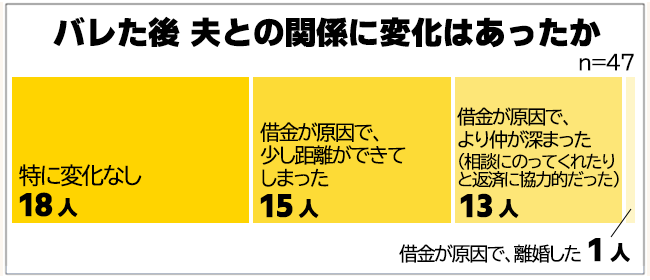 中には本当に離婚してしまう人もいるため、絶対にバレたくないと必死だと思いますが、意外にも「返済に協力的だった」という答えが多くみられました。