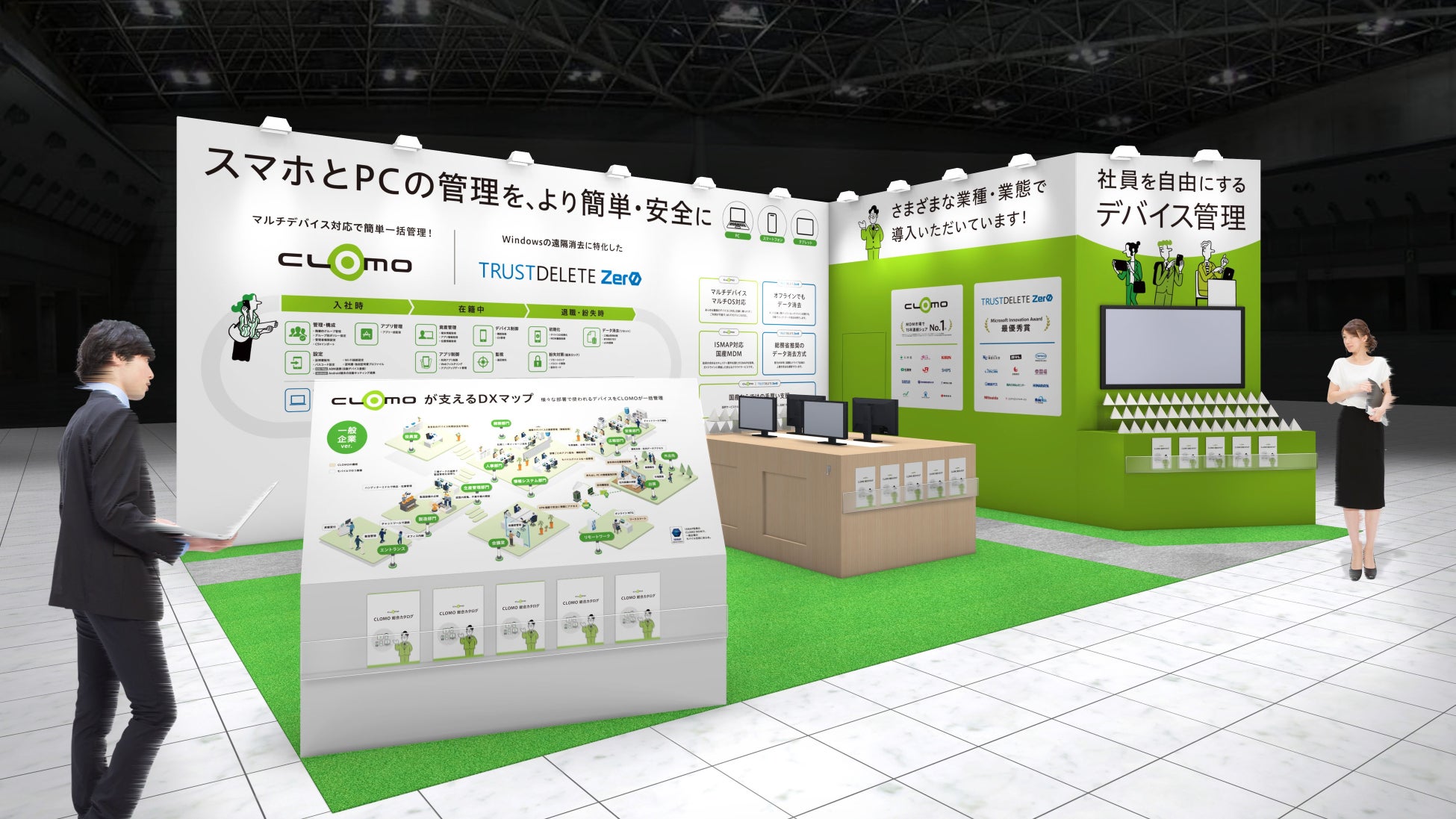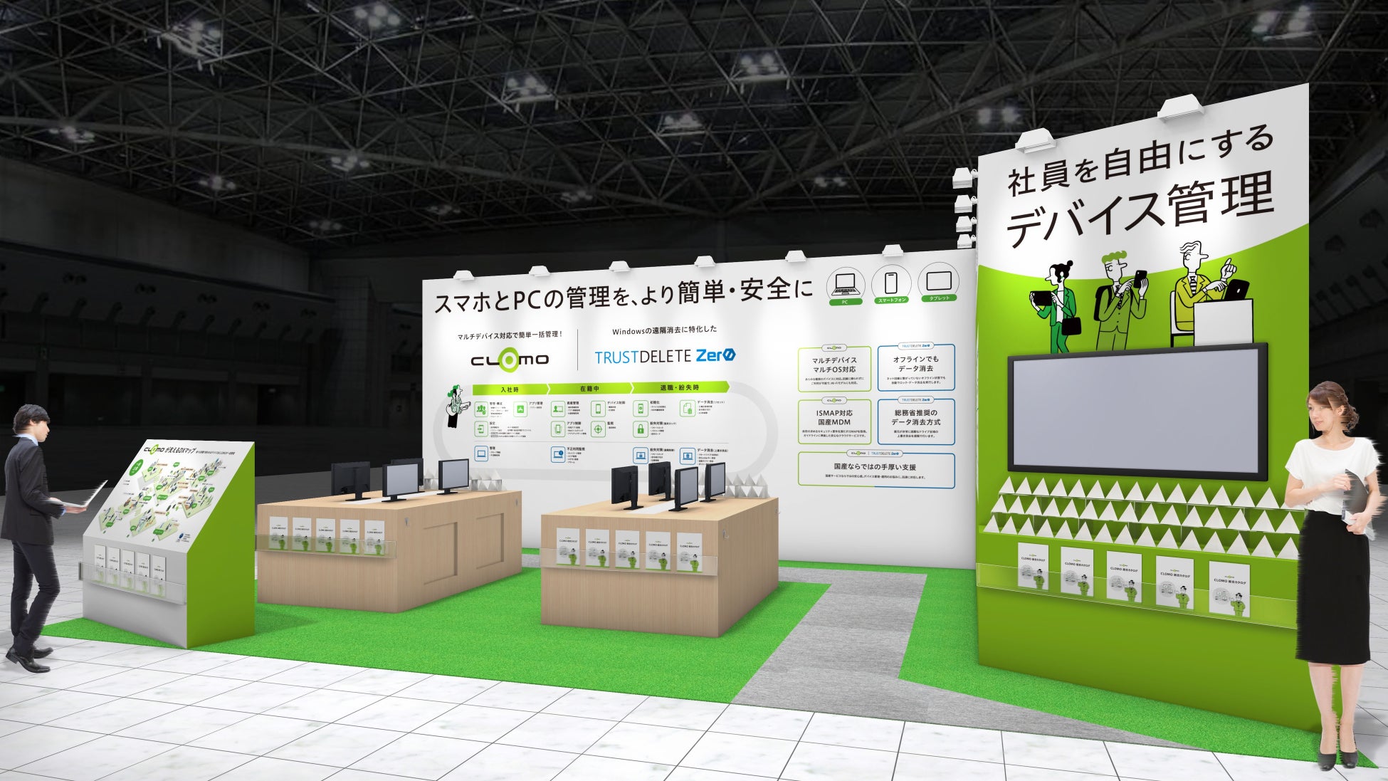 アイキューブドシステムズが提供する「CLOMO MDM」と、ワンビが提供する「TRUST DELETE Zero」の2製品を、西1ホール W1-77 のブースに集約し、情報システム部門向けに端末管理からセキュリティ対策までを一括で提案します。