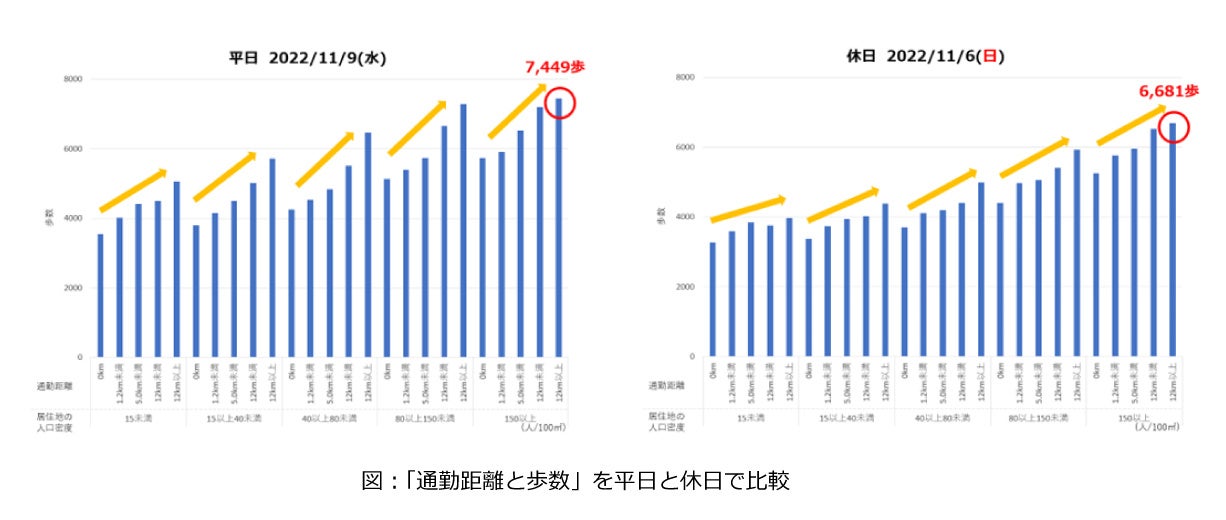 次に、人口密度による分類に加えて、自宅から職場までの通勤距離によるクロス集計をした結果、人口密度が同程度のエリアでも通勤距離が長い人ほど歩数が多いことが分かりました。さらに、その傾向が平日だけでなく休日も同じであることが判明しました。