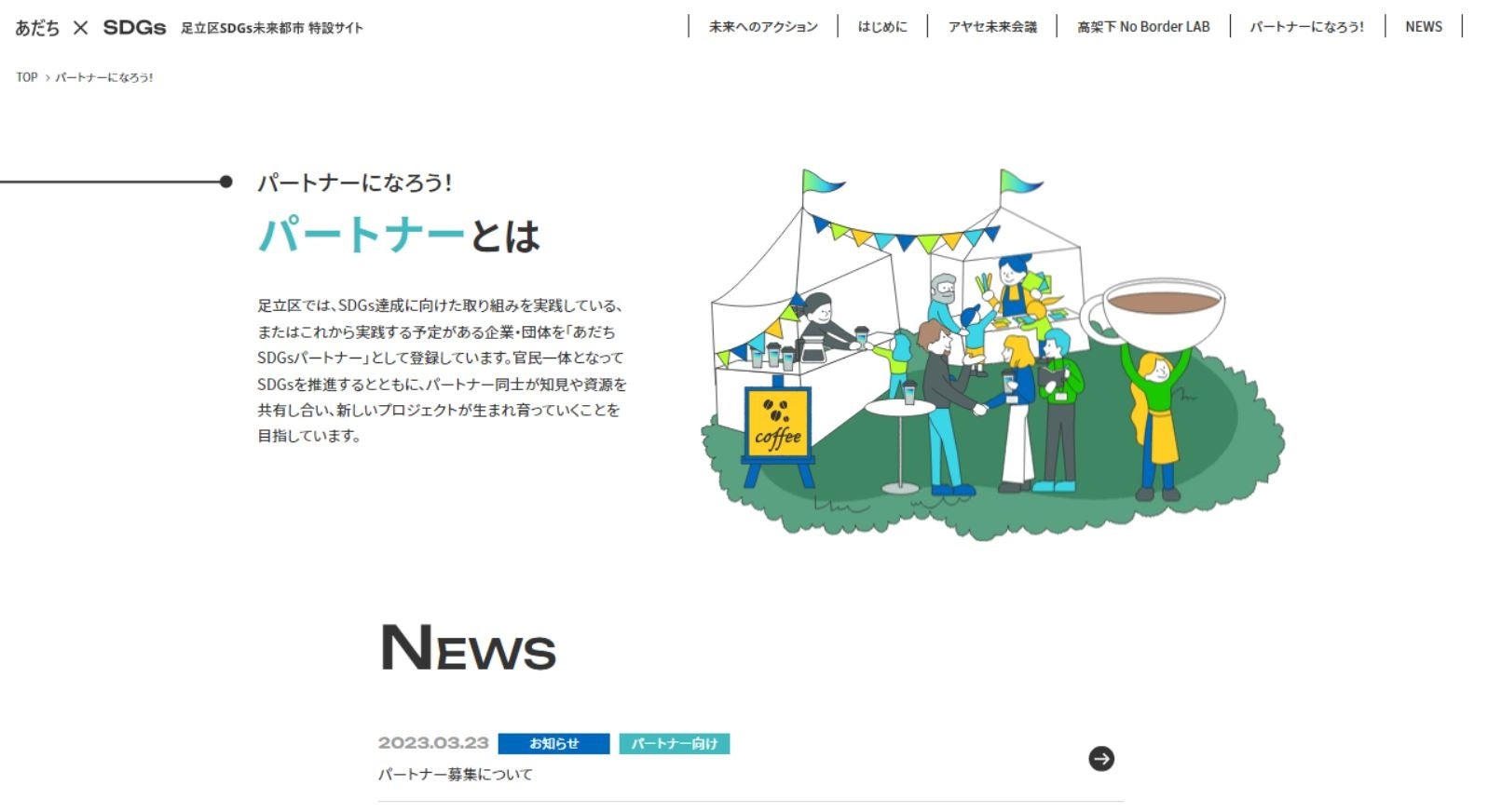 SDGsに取り組んでいる企業・団体を「あだちSDGsパートナー」として登録する制度を令和5年4月上旬から開始。本サイトでは、パートナーの登録申請の受付を行うほか、パートナーが相互にアイデア募集や提案を行うためのマッチング掲示板の機能を設けています。