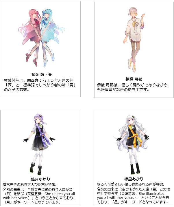 ~第1弾は「琴葉 茜・葵」「伊織 弓鶴」「結月ゆかり」「紲星あかり」~