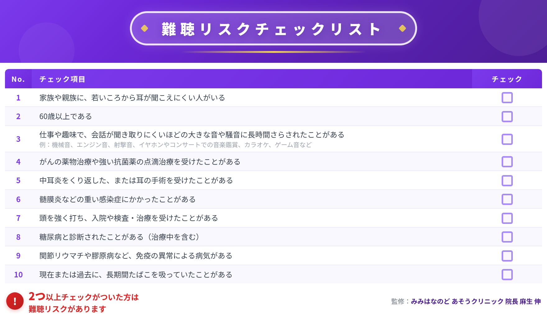 難聴リスクチェックリストを監修した「みみはなのど・あそうクリニック」院長の麻生伸先生は「難聴は進行に気づきにくく、放置すると認知機能の低下を加速させる要因にもなるため、早期対処が不可欠です。補聴器を”隠すもの”から”魅力的で便利なツール”へとパラダイムシフトを起こすことが、聞こえに悩む方の背中を押し、早期受診につながると確信しています」とコメントしています。