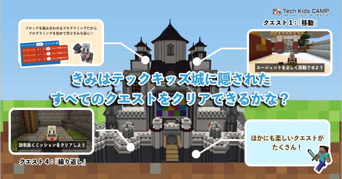 マインクラフトコースでは、Tech Kids CAMP独自の教材を用いて、クエスト形式でプログラミングの考え方を学びます。約150種類の教材を用意しており、街づくりや仕掛けづくり、冒険要素を取り入れるなど、何度参加しても異なる作品づくりを楽しむことができます。