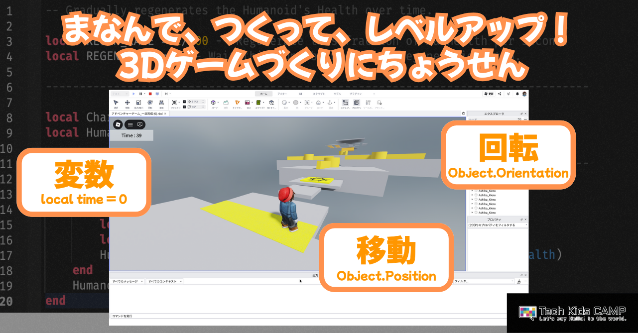 ロブロックスコースでは、「Roblox Studio」とTech Kids CAMP独自の教材を使用し、動きのある仕掛けを取り入れた3Dゲーム制作に挑戦します。