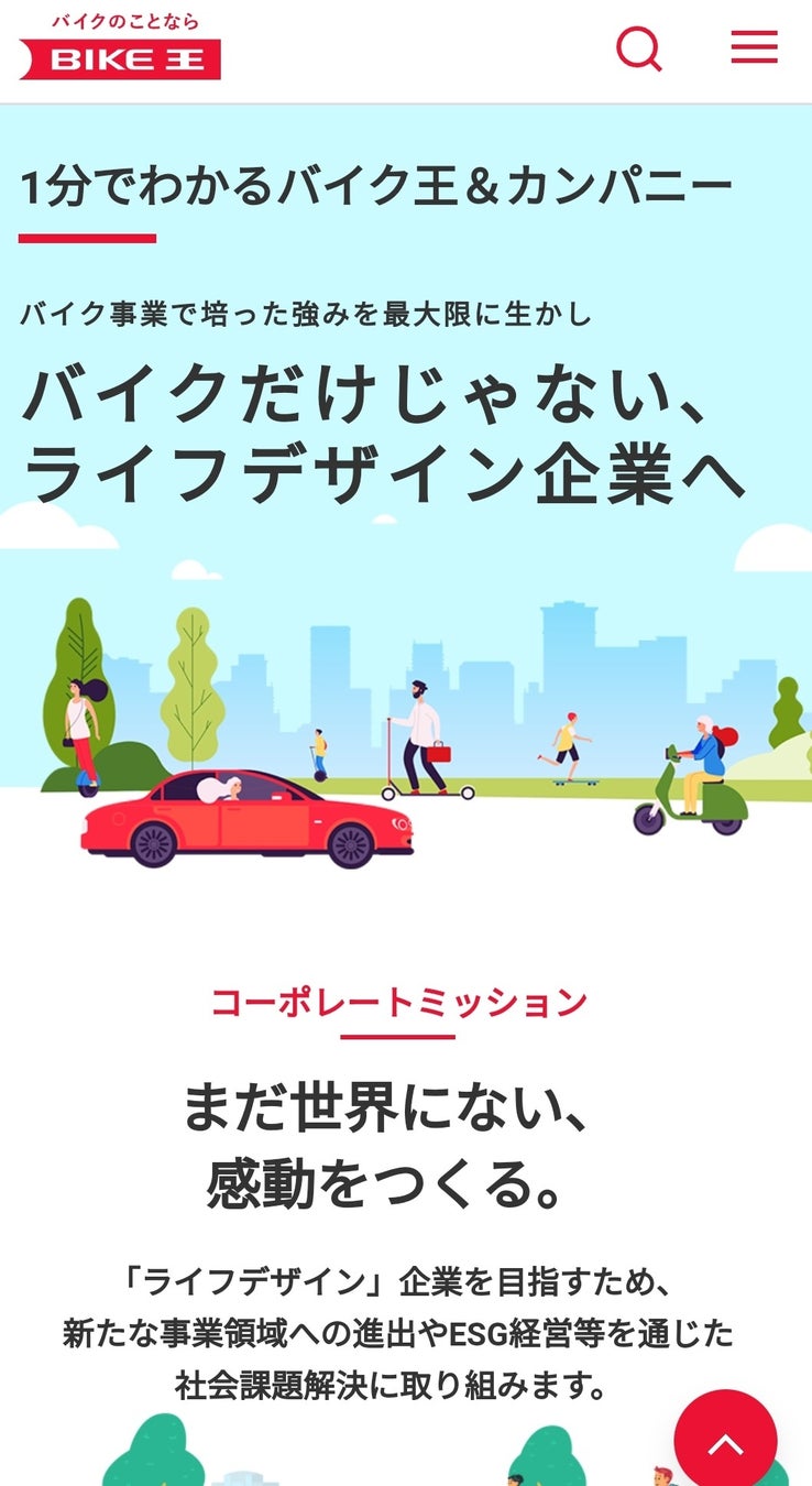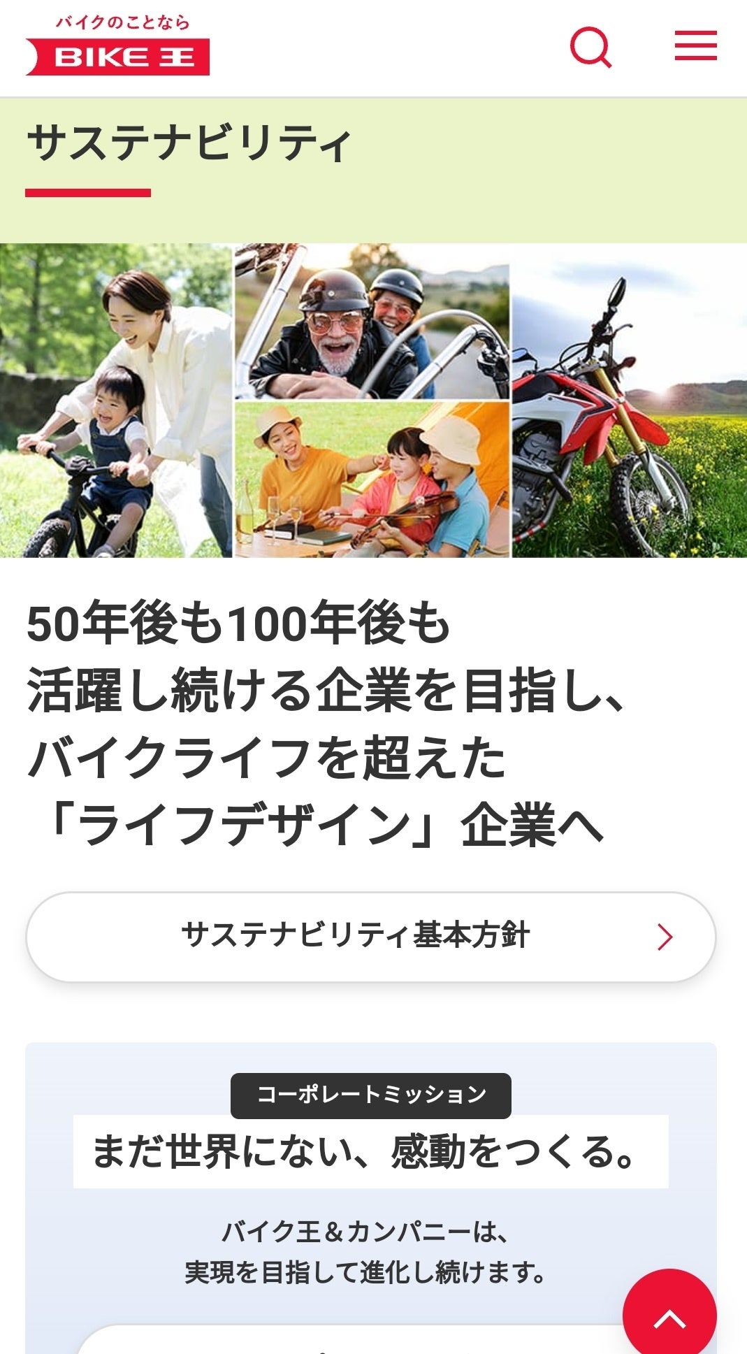 トップページは、バイクを「売る」「買う」「楽しむ」ための様々なサービスの提供を通じて、お客様の豊かなバイクライフを共に創る存在、「バイクライフの生涯パートナー」に加え、新規事業参入によるバイク事業とのシナジー効果の創出、社会課題の解決を通じて50年後も、100年後も活躍し続ける、バイクライフ企業を超えた「ライフデザイン企業」の実現をイメージしています。