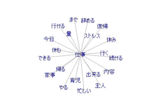 また、「仕事」には家事や育児といったワードが結びついており、夫の仕事と関連して、家事や育児といった話題が頻繁に挙げられていることがわかります。