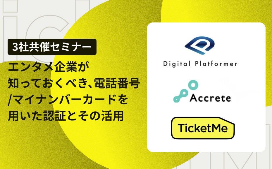 この度、株式会社チケミー、Digital Platformer株式会社、株式会社アクリートは共催Webセミナー「エンタメ企業が知っておくべき、電話番号/マイナンバーカードを用いた認証とその活用」を開催いたします。2024年2月9日(金)16時よりオンラインにて開催いたします。