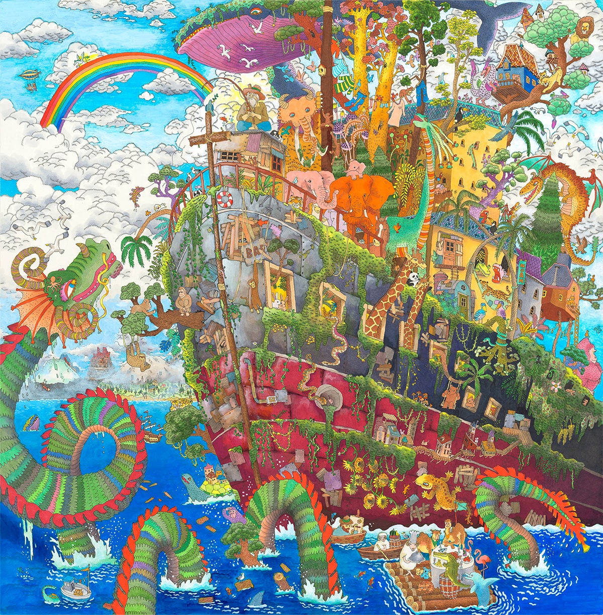 本個展では、新作「ノアの楽園」をはじめ、ライフワークの「ラクガキ」作品や版画を一堂に展示します。