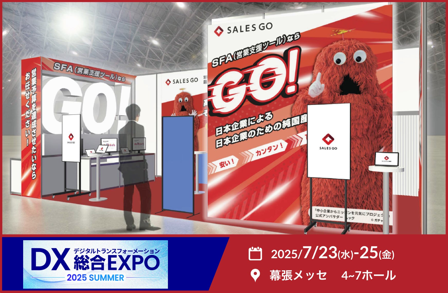 SFAとインサイドセールスで営業のデジタル化と売上の拡大を支援するSALES GO株式会社(所在地:東京都中央区、代表取締役社長:内山 雄輝、以下SALES GO)は、2025年7月23日(水)~25日(金)、幕張メッセで開催される「DX 総合EXPO 2025 夏 東京」内の「営業DX EXPO」に出展いたします。ブースでは、最新のマーケ・営業支援ツールやノウハウ、お客様事例を多数ご紹介いたします。
