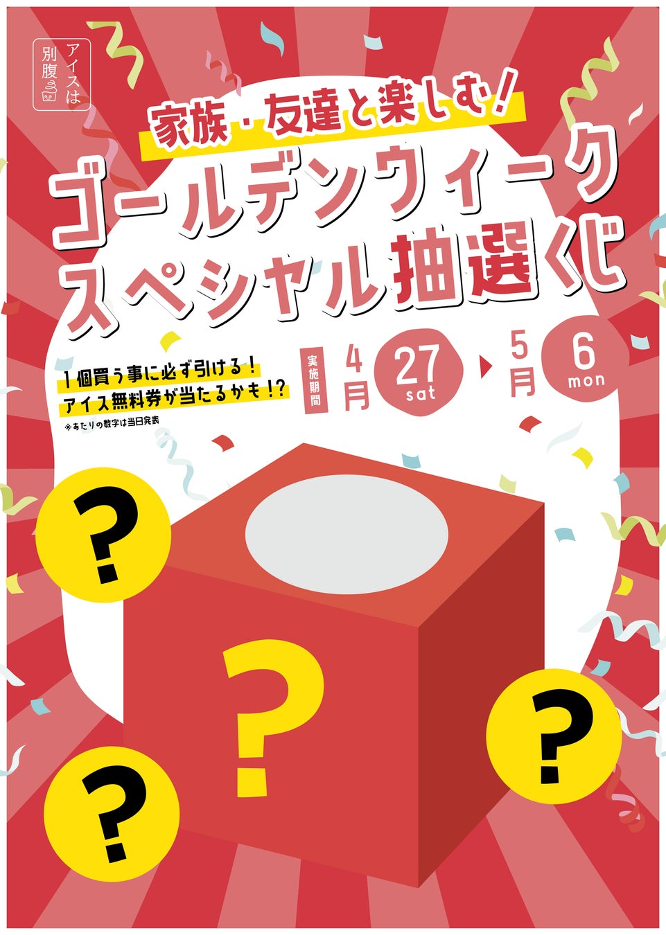 アイスは別腹石橋駅前店 GW期間限定特別企画毎日変わる「3つの大当たり番号」しかも、ハズレくじなしの「ゴールデン抽選会」開催‼