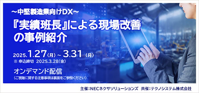 NECネクサソリューションズ株式会社は、「『実績班長』による現場改善の事例紹介」セミナーを3月31日(月)までオンデマンド配信します。お申し込みは3月28日(金)まで受け付けています。