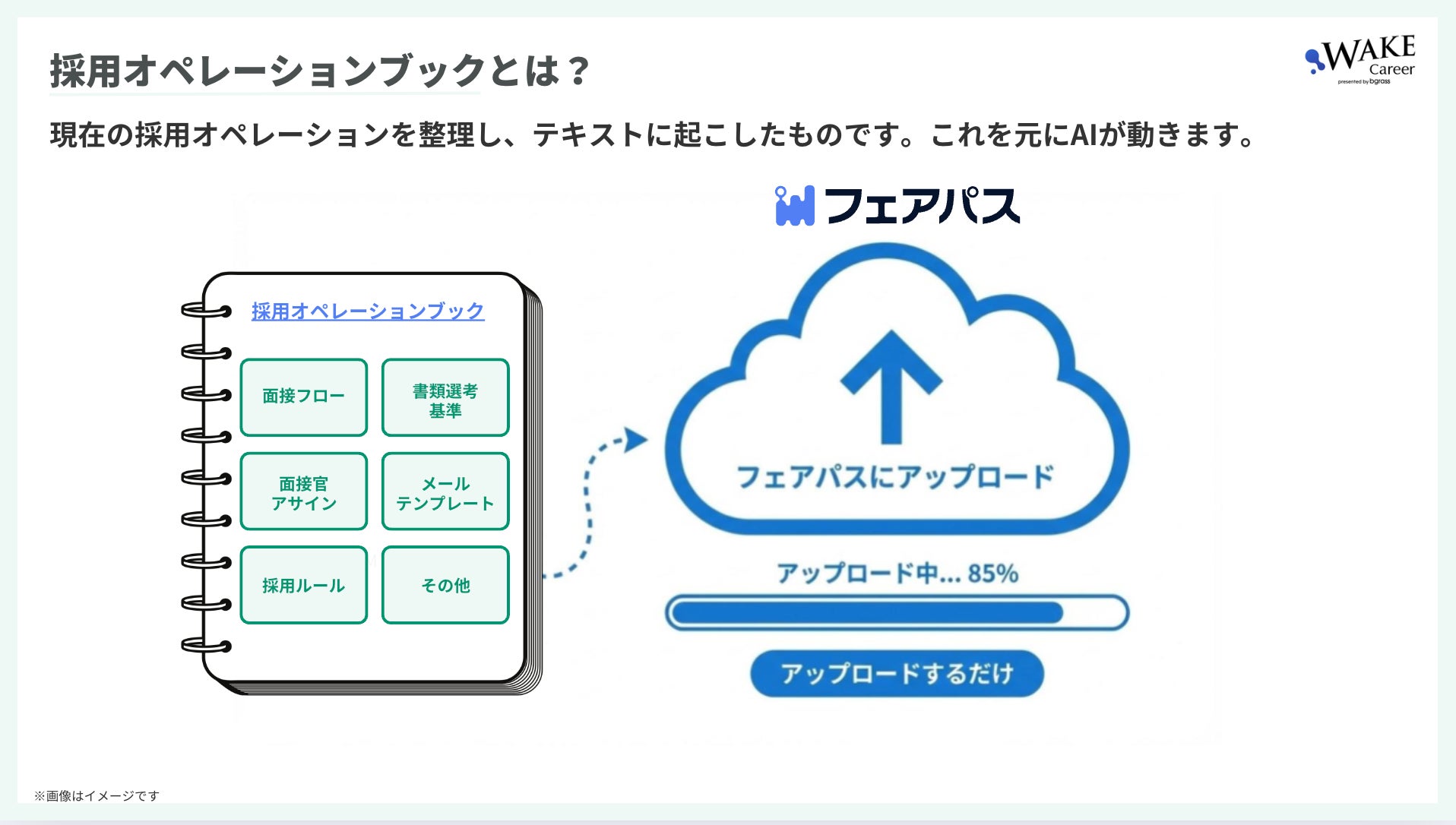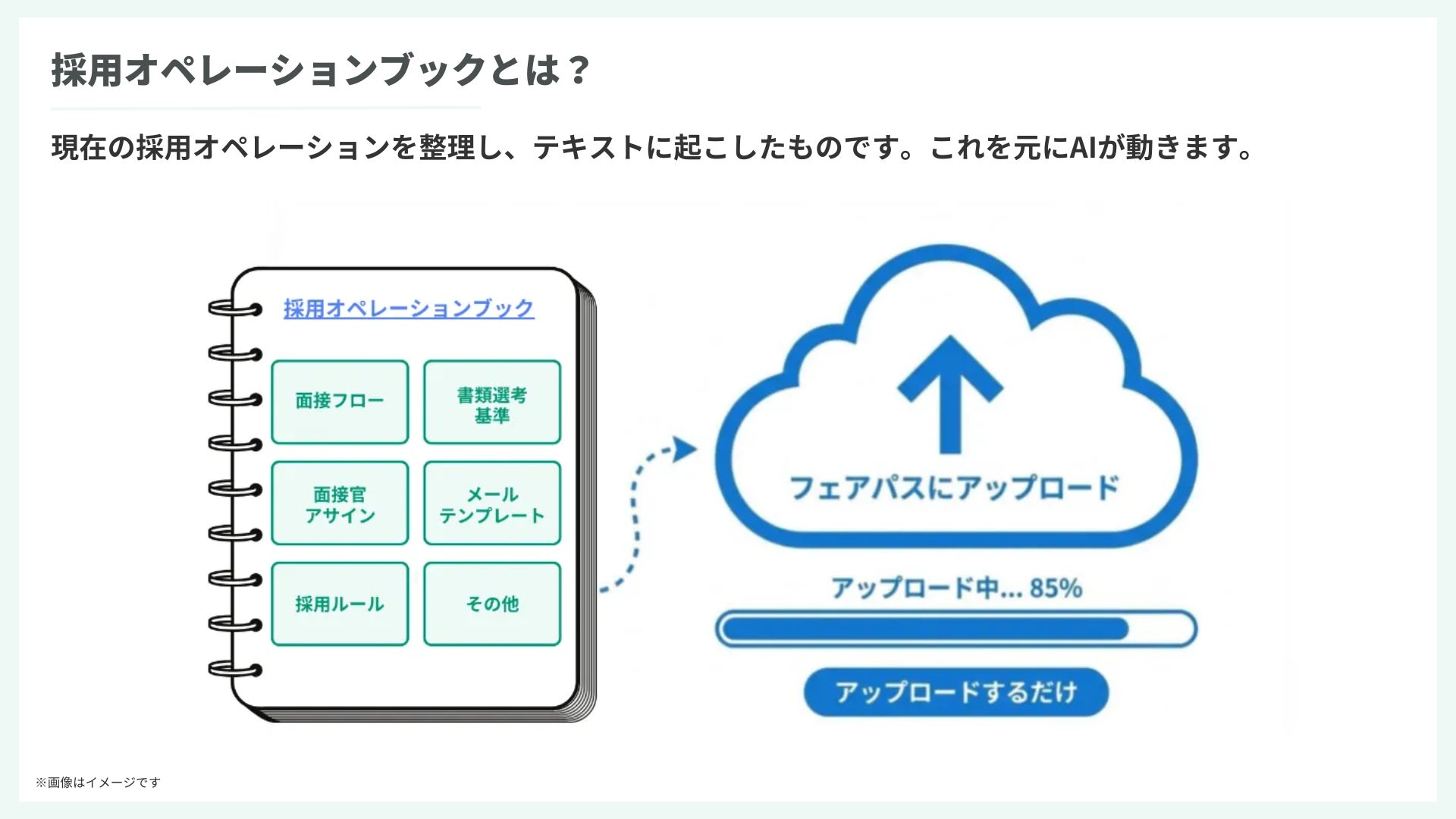 フェアパスは、導入企業が採用フローや評価基準、連絡ルールなどを整理した「採用オペレーションブック」を作成し、アップロードするだけで、AIアシスタントが企業ごとの採用運用を理解し、日々の採用業務を自動で実行し始めます。