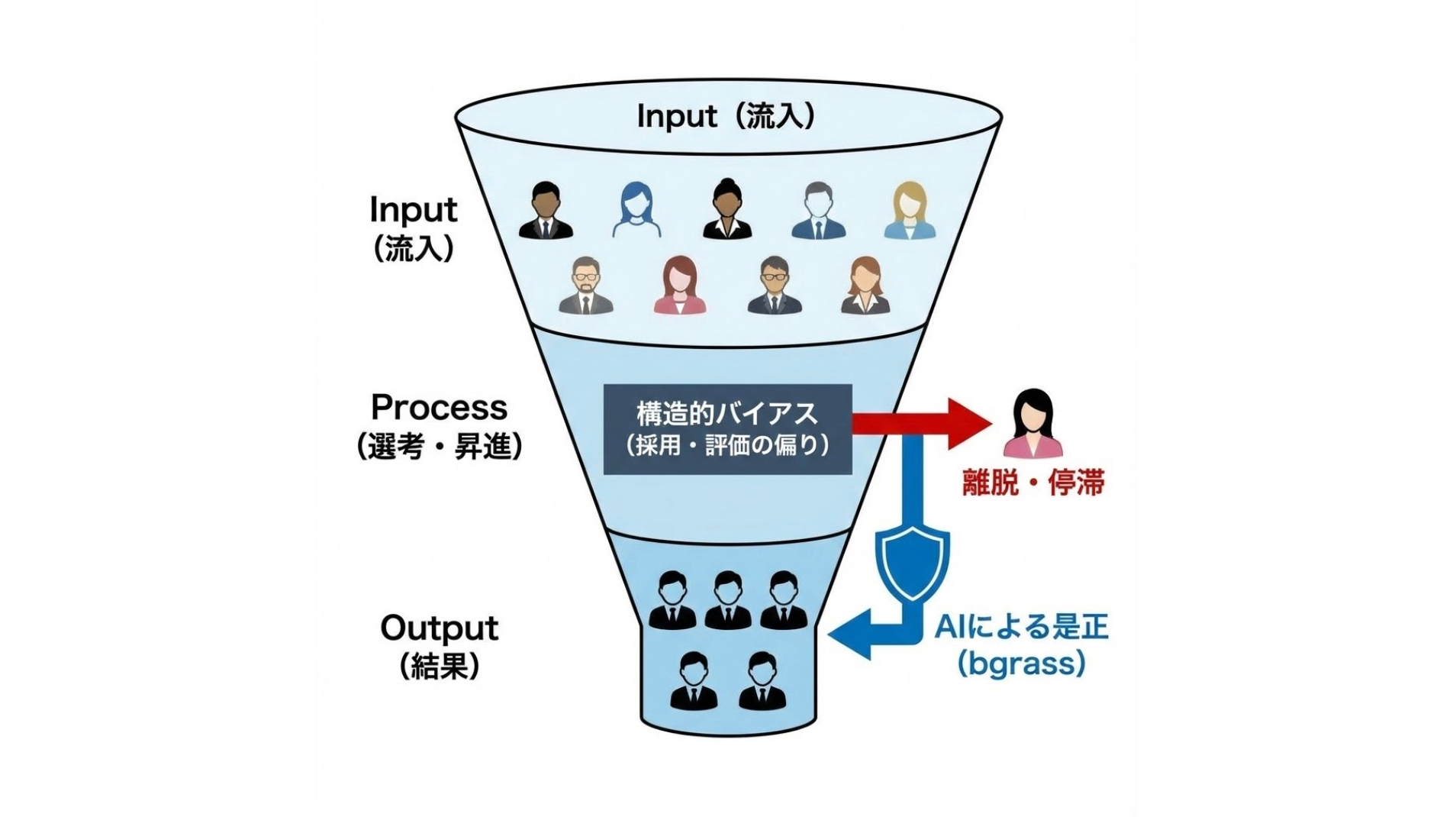 その要因を把握するため、bgrassでは採用プロセスに関するデータ分析を実施しました。その結果、候補者個人の意欲や能力だけでは説明しきれない、選考プロセスや評価運用に起因する差や偏りが見られるケースがあることが分かってきました。