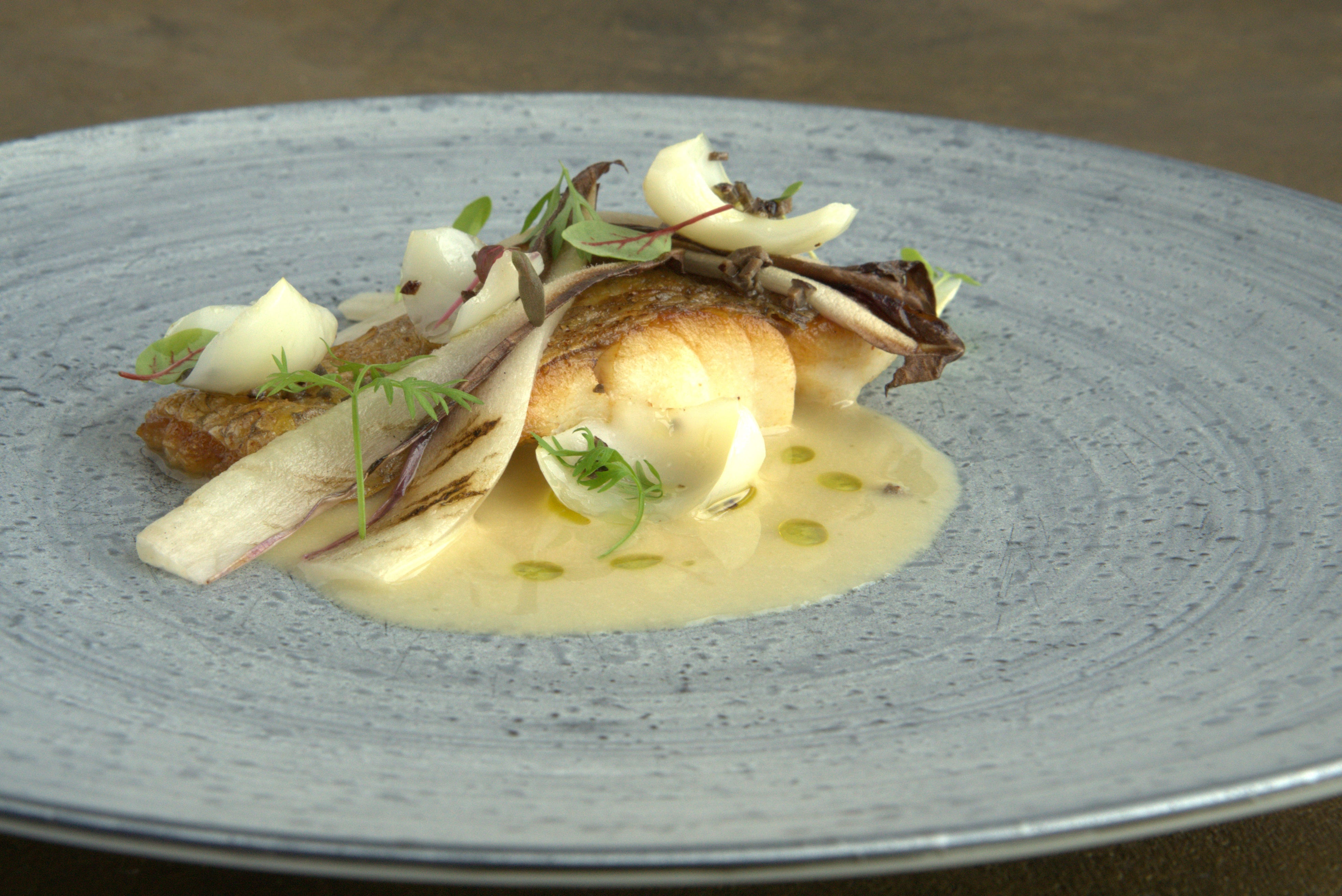 ・ホタテ貝のポワレとジャガイモのピュレ カレー風味