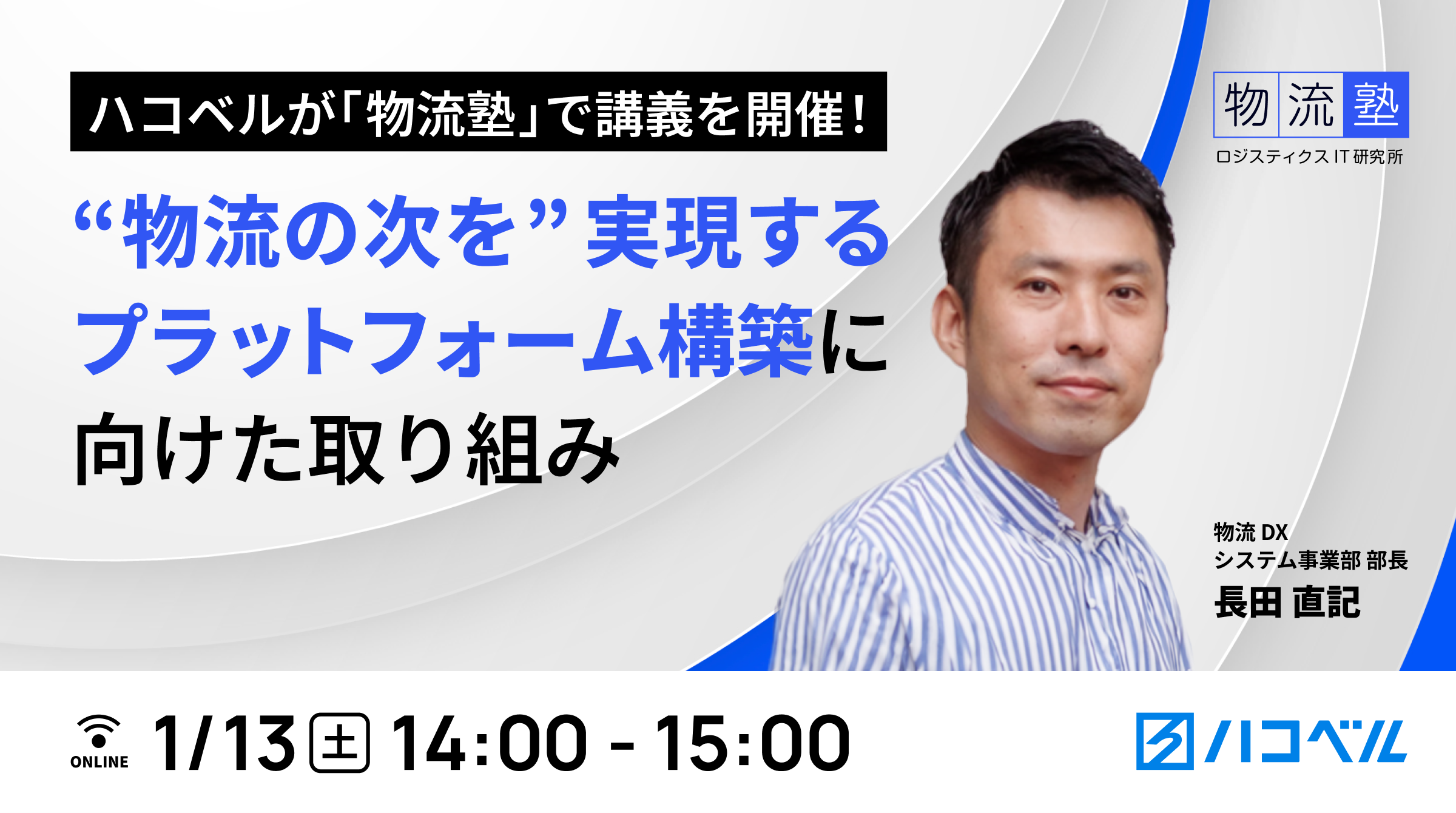 このたび、2024年1月13日(土)に開催する第260回「物流塾」において、ハコベル物流DXシステム事業部長の長田 直記が講義を実施いたします。「物流の “次” を発明する」というミッションに基づき、輸送のプラットフォームとなるべく事業を推進するハコベルの現在の取り組みについて、実際の事例と共にお話いたします。参加方法は実会場とオンラインの聴講が選択でき、いずれも「物流塾」で申し込みを受け付けております。