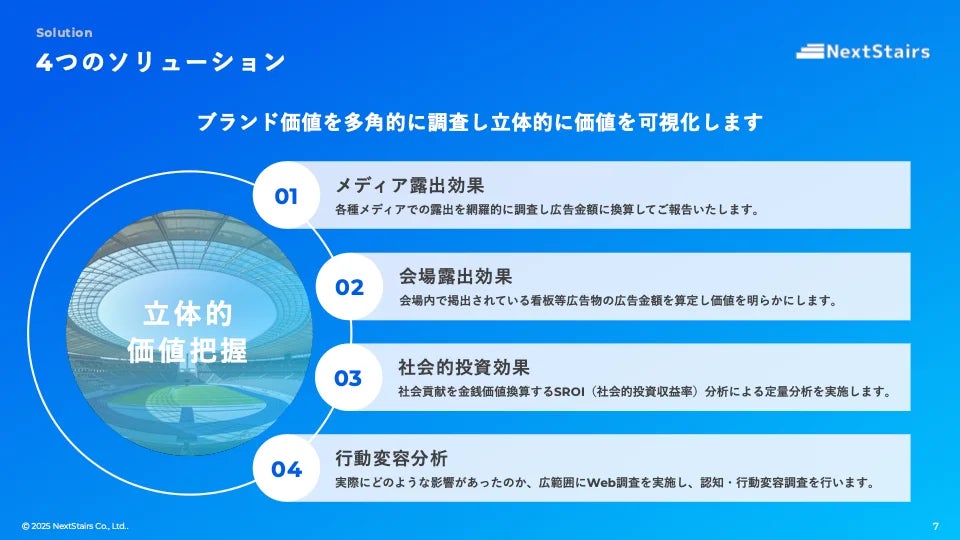 株式会社NextStairsは「インサイトを通じて、あらゆるスポーツの価値を高める」をミッションとし、AI×テクノロジーの力におけるデータ分析技術を駆使して、インサイトを導き出し、スポーツチームが直面する課題の解決をすることで、あらゆるスポーツの価値を高めることができる社会を実現したいと考えております。