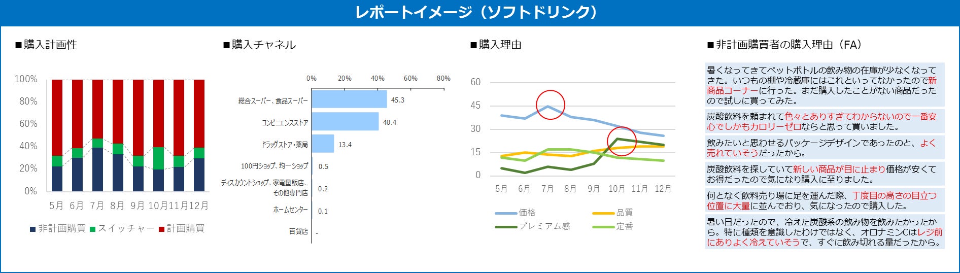 従来のPOSデータでは難しいカテゴリ全体の傾向や購入チャネル・チェーンでの購入状況の把握や、販売データの裏側にある商品購入者の意識(プロセス)に迫ることが可能です。