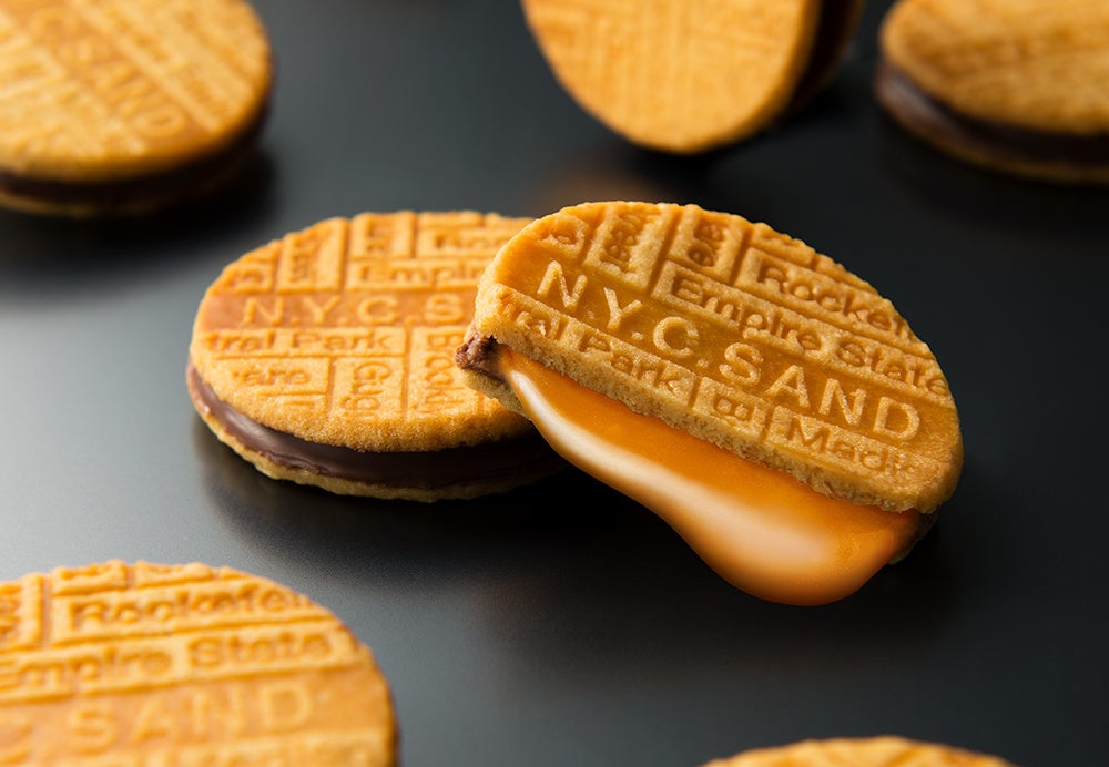 看板商品の「N.Y.キャラメルサンド」は口どけのよいクーベルチュールチョコレートで、生クリームと黒糖をとろとろに炊き上げたキャラメルを包み込み、 オリジナルの焼印をつけたバターたっぷりの香ばしいクッキー生地でサンドしています。お口の中でクッキー、チョコレート、キャラメルそれぞれが一度ほどけ、再び絶妙なハーモニーを醸し出します。