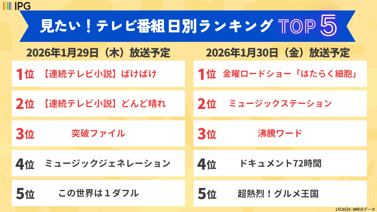 今週見たい番組は?「アクセス集中」2026年冬のテレビ番組ランキング!日別TOP5を発表【Gガイドテレビ番組表調べ】(1/29~2/3放送)