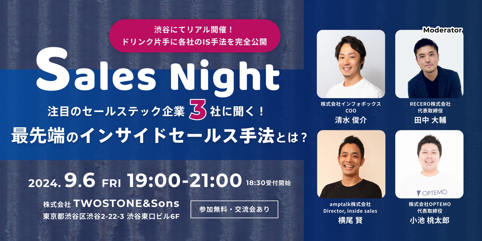 BtoB SaaSのインサイドセールス支援事業を展開するRECERO株式会社と最先端SalesTechを提供する株式会社OPTEMO、amptalk株式会社、株式会社インフォボックスは、「Sales Night! 注目のセールステック企業3社に聞く!最先端のインサイドセールス手法とは?」というテーマの無料のオフラインイベントを開催します。
