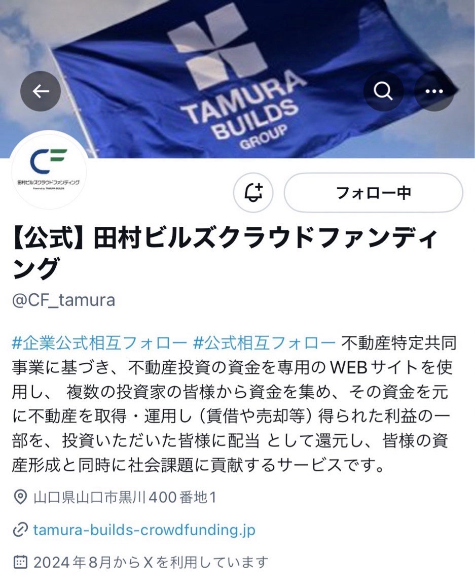 株式会社田村ビルズ(本社: 山口県山口市黒川 代表:田村 伊幸)が提供する田村ビルズクラウドファンディングのX公式アカウント(旧Twitter)を開設いたしました。これまで公式サイトにて情報発信を行っておりましたが、気軽に見ることができるXアカウントを通じて、情報をより迅速にお届けします。不動産投資に関することだけでなく、何気ない日常の出来事やお役立ち情報なども随時発信していく予定です。