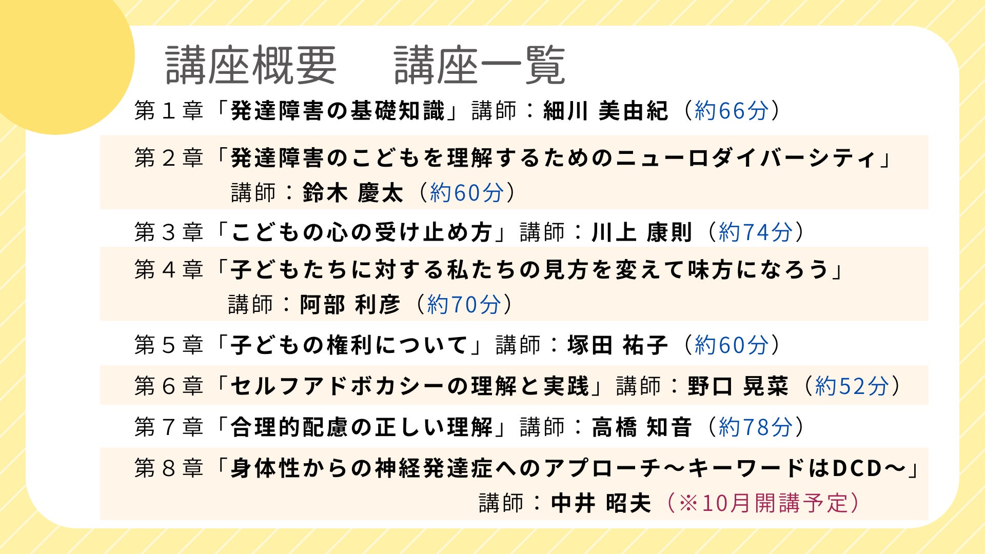 講座は「発達障害とは何か」から始まり、LD・ADHD・ASDなどの特性、ニューロダイバーシティ、心の受け止め方、リフレーミング、こどもの権利やアドボカシー、合理的配慮まで、こどもを取り巻く多様な背景に目を向け、事例やワークを通して学校現場や支援の現場で活かせる基礎的な知識と実践的な視点の習得をめざします。