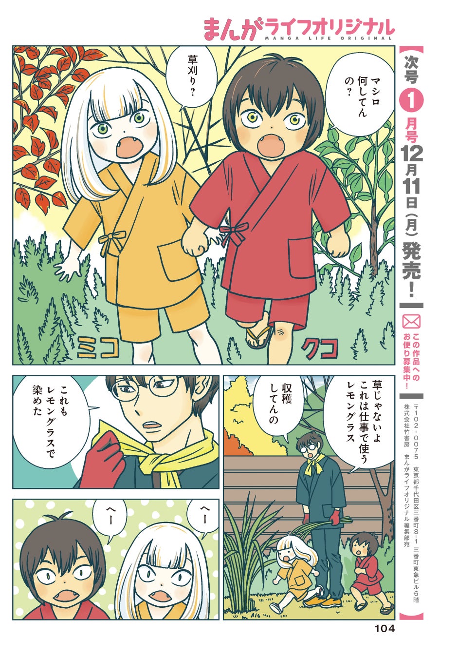 株式会社竹書房刊「まんがライフオリジナル」にて、2023年11月10日(金)発売の12月号から「ねこまた印の染物屋さん」(宇仁田ゆみ・著)の連載を開始いたします。
