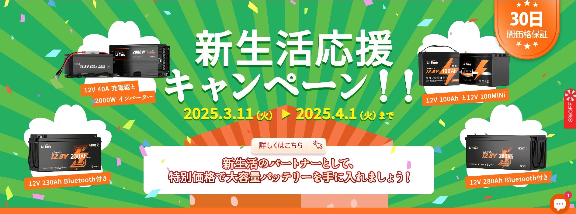 LiTimeの春の新生活応援キャンペーン開催中!大容量バッテリー最大60%割引!リン酸鉄リチウムイオンバッテリーやBluetoothモデル、サブバッテリーが対象。さらに、全注文8%OFFクーポンも!
