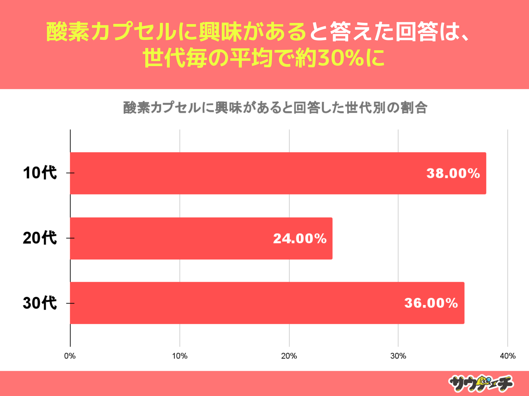 酸素カプセルに行ったことはないが興味はあると回答した割合を世代別でみてみますと、10代の38%が最も高く、次いで30代の36%、20代が24%で、世代毎の平均が約30%という結果になりました。
