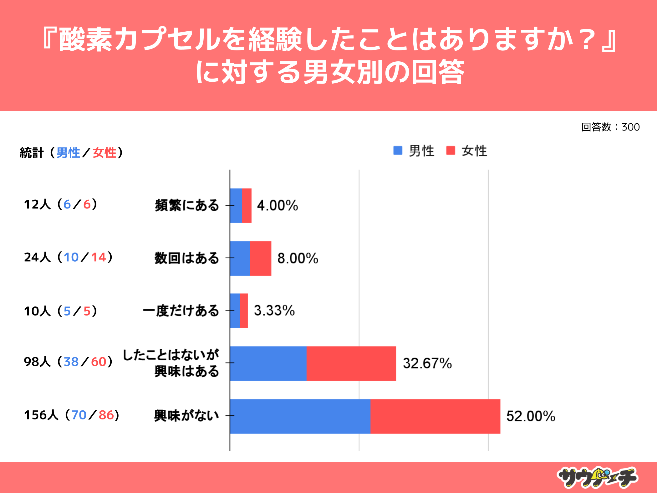 次いで多かったのが「したことはないが興味はある」と回答した方の32.67%、「数回はある」という回答が8%、「頻繁にある」という回答が4%、「一度だけある」という回答が3.33%で、10〜30代男女の15.33%が酸素カプセルの経験があることがわかりました。