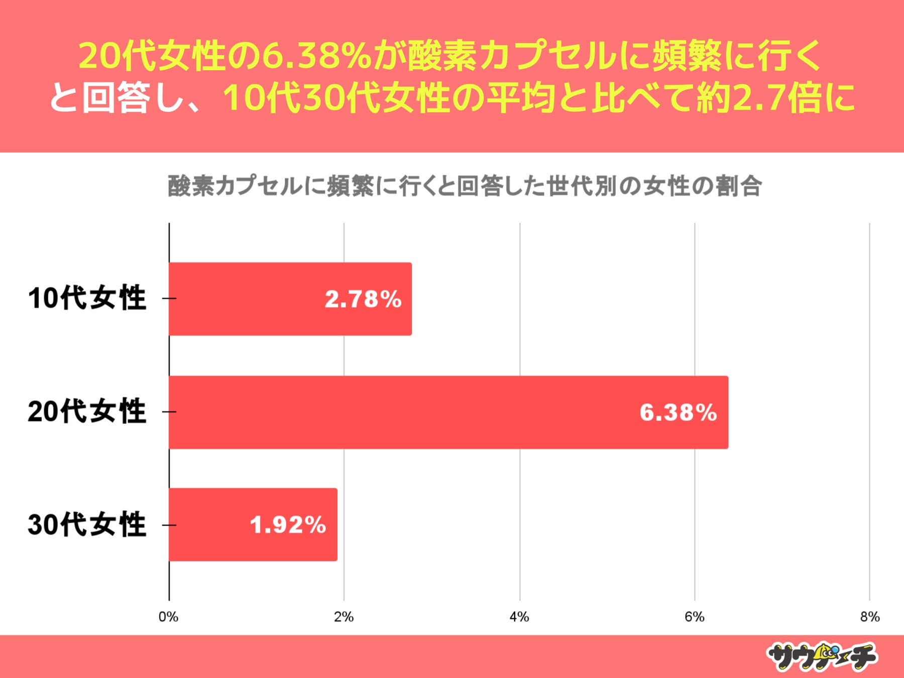 【20代女性の6.38%が酸素カプセルに頻繁に行くと回答し、10代30代女性の平均と比べて約2.7倍に】