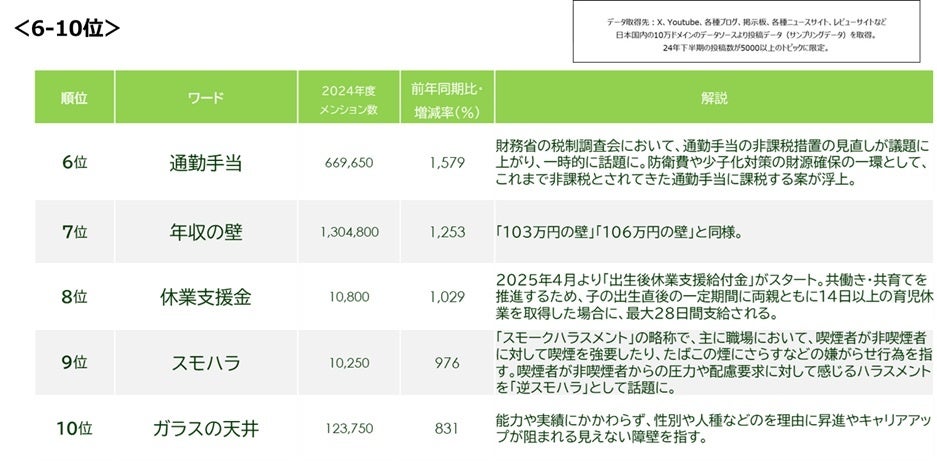 目立ったのは、社会保険料や所得税負担について、与野党の間で、金額見直しや撤廃の議論が活性化し、関連ワードは急激に話題を集めた。そもそもの制度の複雑さも手伝って、解説記事やコメントも大量に投稿された。労働力不足や物価高が進む中で、社会全体に大きく影響を与える制度変更であり、25年度も引き続き議論は活性化しそうだ。