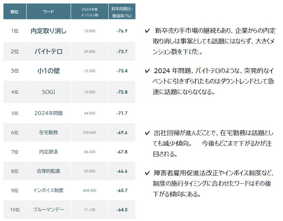 2024年度下半期において、前年同期からの投稿減少率が高かったトピックは以下。