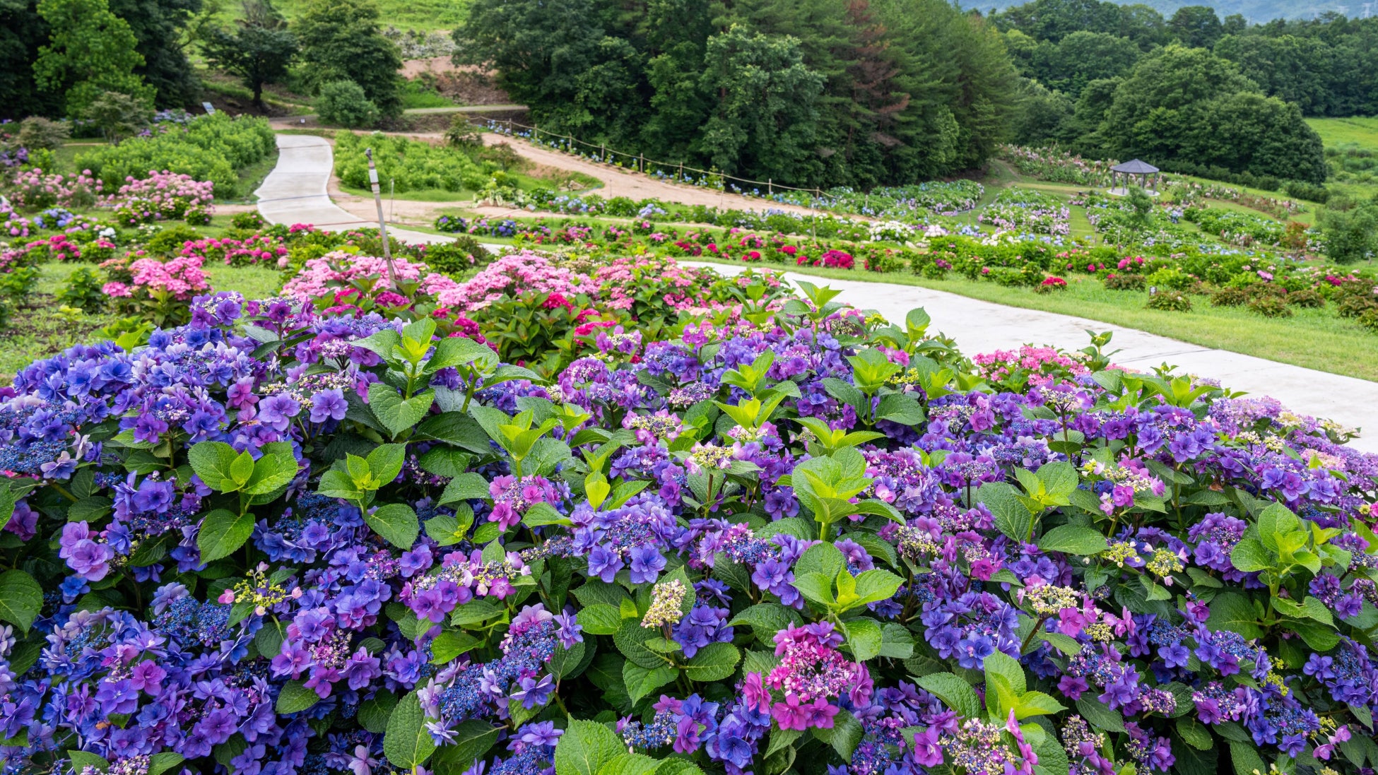 4つの花観光農園で季節の花をお楽しみいただけます。今回ご紹介した「あじさいとタチアオイの丘」の会場は「Flower village 花夢の里」です。