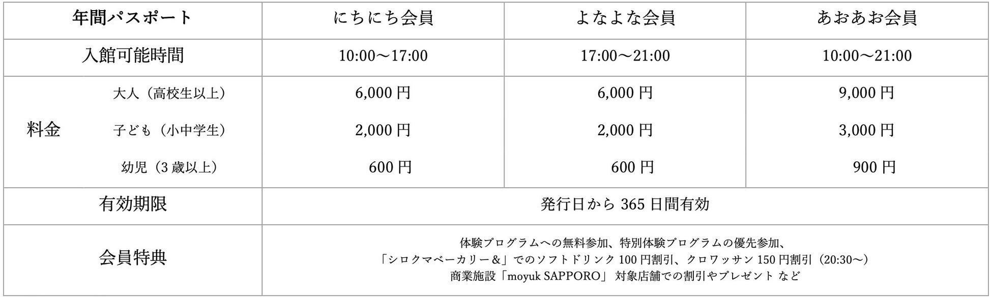 「すいぞくかんクラブ」は、水族館を日常的に楽しんでいただくための会員制度です。生物に関する体験プログラムや、定期的に開催されるイベントなどの優先参加、「シロクマベーカリー&」の一部メニューの特典のほか、商業施設「moyuk SAPPORO」対象店舗での割引やプレゼントなどが受け取れます。会員になるとAOAO SAPPOROの年間パスポートが発行されます。
