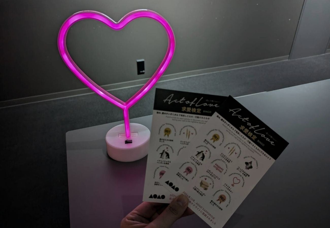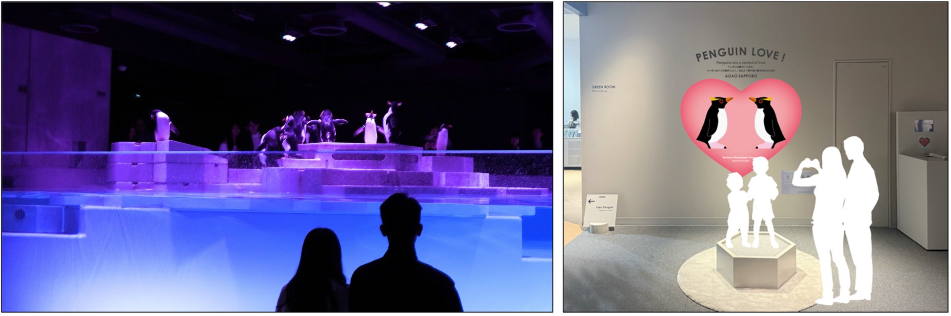 現在開催中の企画展「愛のすいぞくかん」では、ペンギンたちの求愛期に合わせて昼と夜で異なる内容の、愛の展⽰を⾏い、多くのお客様にご来館いただいています。特に夜は、⼤⼈の⽅でも楽しめるコンテンツとして「求愛検定 BINGO」、「求愛診断」、ハートのネオンサインなど、愛の気配に溢れた場になっており、AOAO SAPPORO の 1 ⽇の中で 19 時以降の来館者数が占める割合が直近 1 週間で約 2.5 倍*1 に増加するなど「新しい札幌の夜の遊び場」として定着しています。