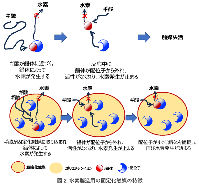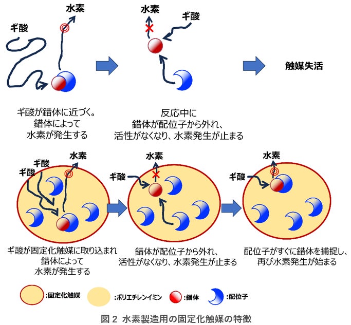 これまでの研究から、錯体触媒の失活は、水素製造時に錯体が配位子から外れることに原因があることを明らかにしてきました。そこで今回の開発では、錯体触媒をポリマー(ポリエチレンイミン)の中に組み込み、配位子を外れにくくしました。さらに、配位子から外れても別の配位子が錯体を再び捉えることで活性を維持し、触媒の長寿命化を実現しました。加えてポリエチレンイミンはギ酸を選択的に吸収する特徴があるため、触媒の高活性化にも寄与しています(図2)。