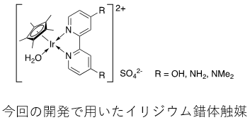 有機金属錯体の一種で、イリジウムの酸化状態、配位子の組み合わせから、非常に多くの種類が存在する。イリジウム錯体に限らず有機金属錯体は、触媒的な性質などのさまざまな性質を示すことが知られており、広く研究が行われている。今回の開発で用いた均一系(イリジウム)錯体触媒は、下記に示すイリジウム錯体を示す。