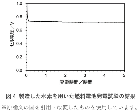 次に2)のギ酸から製造した水素を用いて、固体高分子形燃料電池(一般財団法人日本自動車研究所製標準セル)で発電試験を行いました。その結果、5時間以上出力が下がることのない、安定した発電ができることを確認しました(図4)。