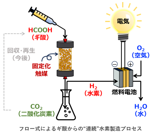 水素キャリアとしてのギ酸の実用性を実証するためには、1)バッチ式からフロー式へのプロセス転換、2)ギ酸由来の水素による燃料電池発電試験での実証が必要でした。