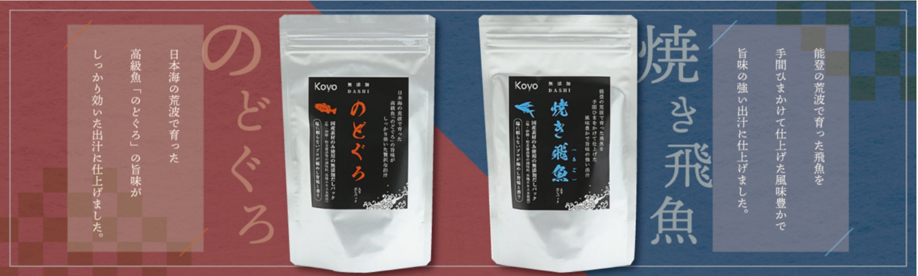 株式会社弘洋は業務用食品卸売会社として、石川県を中心に、全国のレストラン、旅館、病院等への食材提供を行う他、能登の飛魚(あご)やのどぐろなど、国産天然素材、無添加にこだわった“だしパック”の生産、販売も行っています。