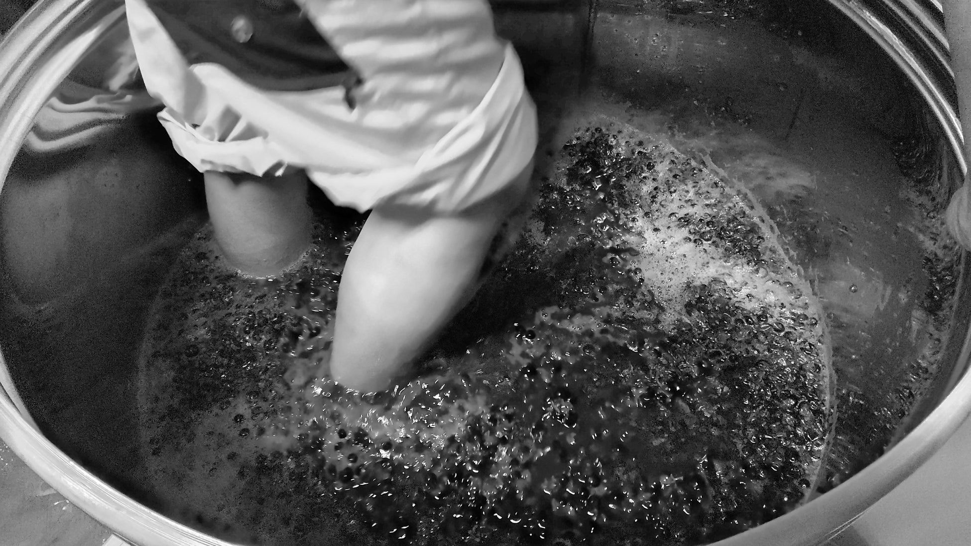 ピジャージュは伝統的な「足踏み」を行いました。普段は専用の棒を使いますが、足踏みをすることで、肌で温度や硬い部分を感じ、その部分をしっかりほぐすことができるので、ぶどうにとってより