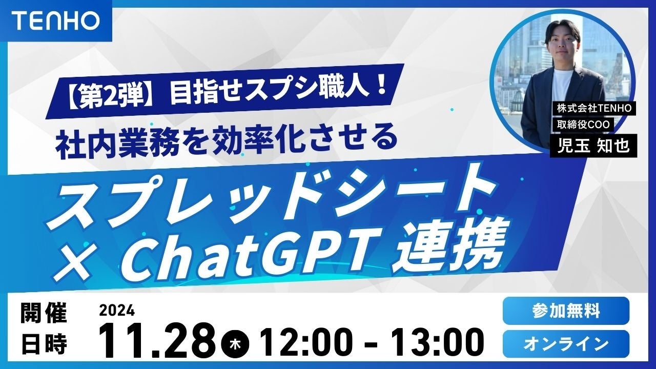 株式会社TENHO(本社:東京都渋谷区、代表取締役:田村 允)は、2024年11月28日(木)12:00〜13:00に、第8回無料ウェビナー「【目指せスプシ職人!】スプレッドシートとChatGPTを連携させた業務自動化【第2弾】」を開催いたします。本ウェビナーでは、生成AIとスプレッドシートを連携させることで実現する業務効率化のさらなる可能性を深掘りし、実践的なハンズオンを通じて具体的な活用方法をご紹介します。