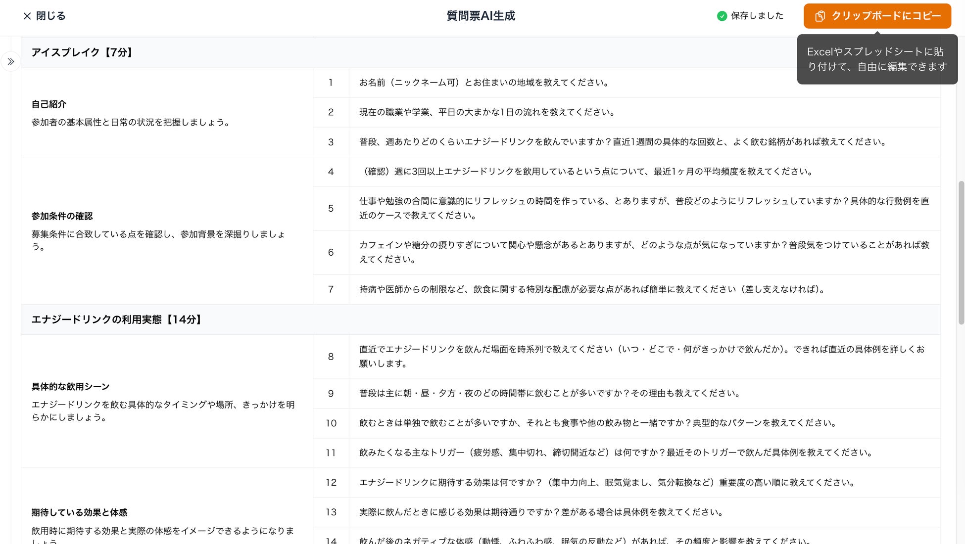 インタビューガイドはコピーも可能なため、Excelやスプレッドシート等に貼り付けてカスタマイズも可能です。