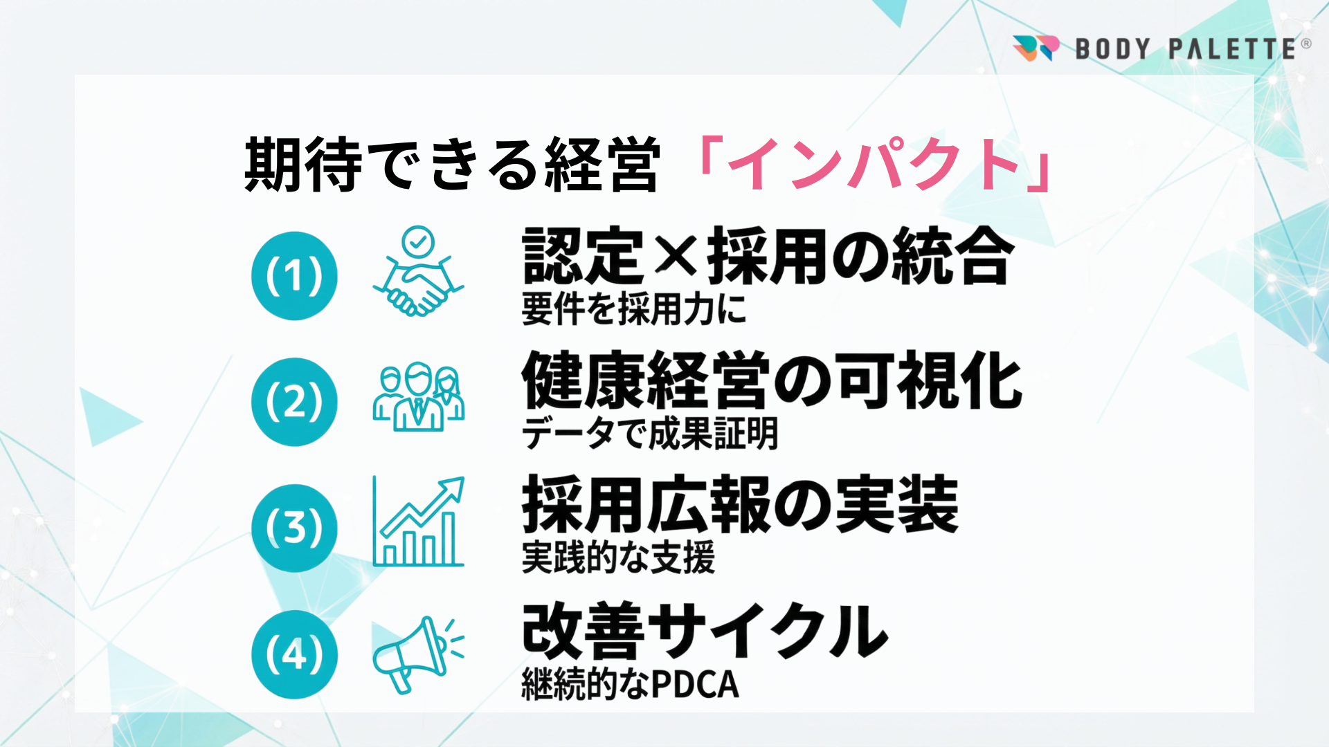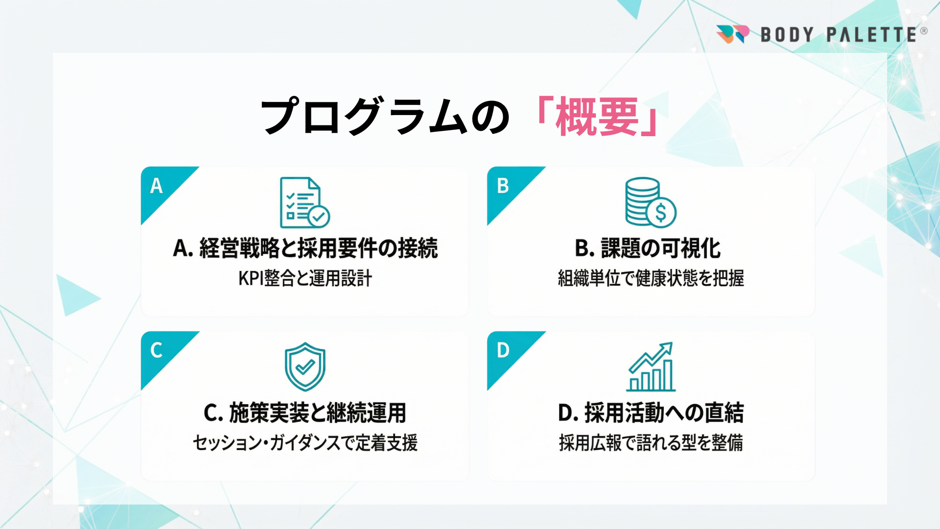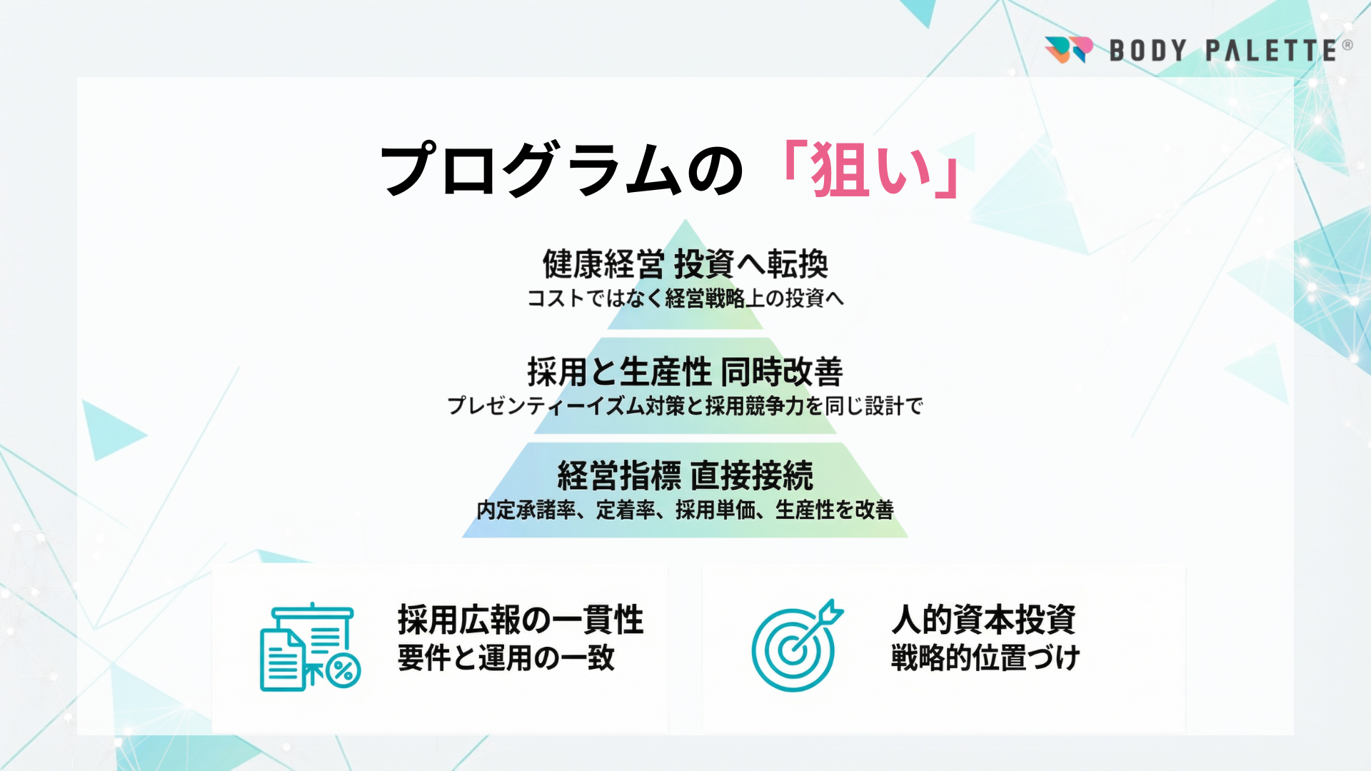 本プログラムの狙いは、健康経営をコストではなく経営戦略上の投資に変え、採用成果と生産性を同時に改善することです。