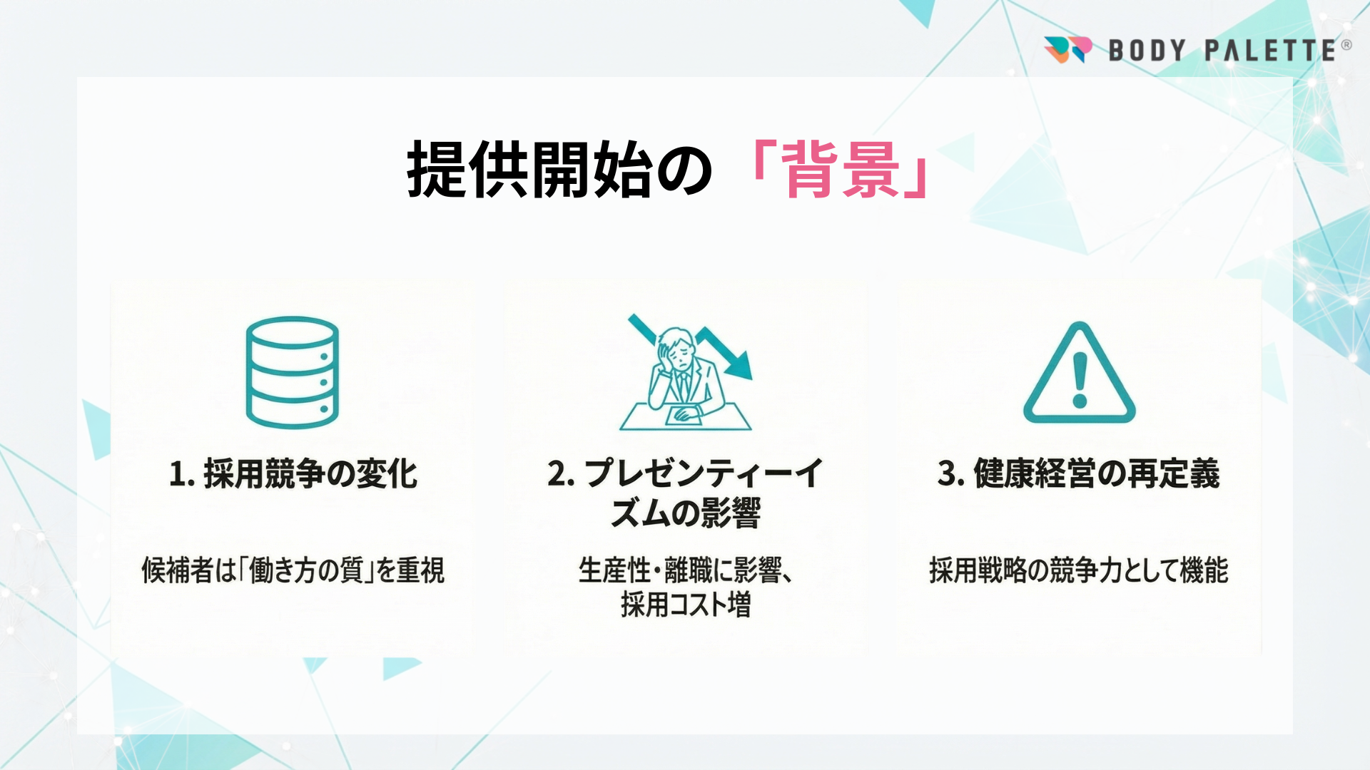特に、採用競争力の強化とプレゼンティーイズム対策を同じ設計で動かす点に、再現性があります。