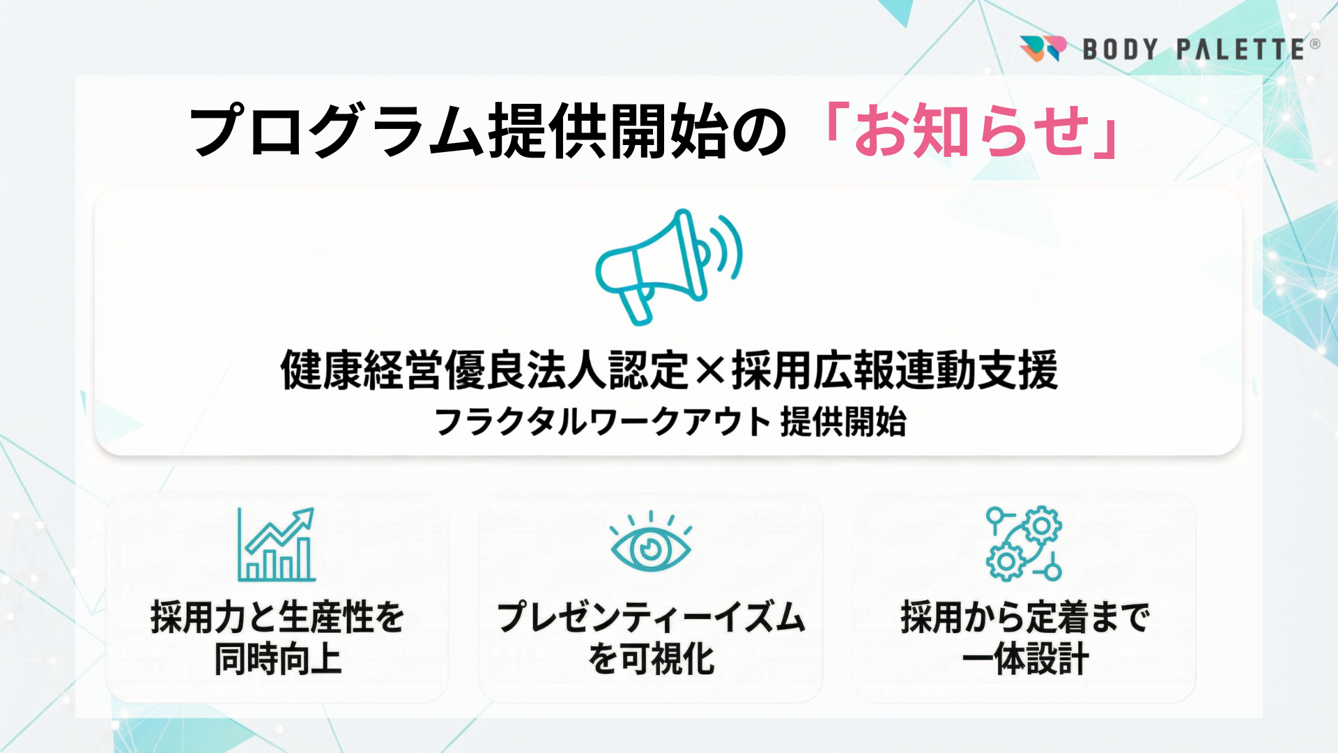 フラクタルワークアウト株式会社(本社:東京都渋谷区、代表取締役:高瀬雅弘、以下 当社)は、【採用戦略連携健康経営】シリーズとして「採用戦略連携健康経営プログラム」の提供を開始しました。