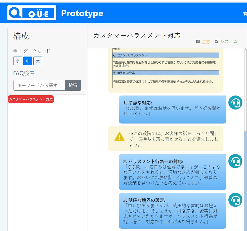 QUEには、ビーウィズのノウハウが集約されたクレーム対応トークサンプルや、カスハラ対応トークスクリプトのサンプルが含まれています。これにより、クレームやカスハラの応対を定型化し、オペレーターの応対品質を向上させることができます。結果として、クレーム対応の早期解決やカスハラ化の未然防止に寄与します。