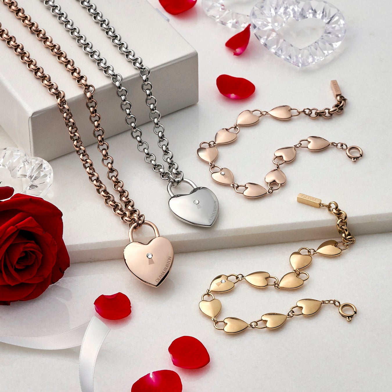 また、ペンダントだけでなく、特別な日のコーディネートをさらに華やかに彩るジュエリーも揃っています。ハートリンクが連なり、中央にクリスタル付きのパドロック(錠前)があしらわれたブレスレットは、大切な人への「心を預ける」気持ちを表現します。