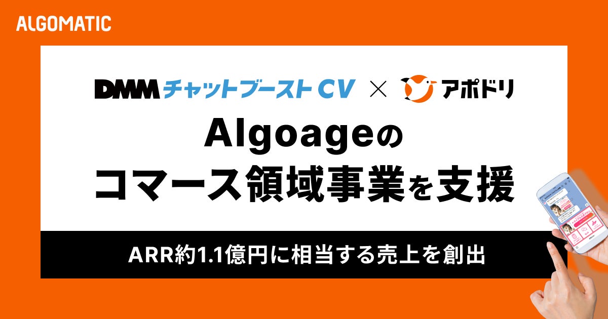 株式会Algomatic(本社:東京都港区、代表取締役:大野 峻典、以下 Algomatic)は、株式会社Algoageが運営する『DMMチャットブーストCV』のエンタープライズセールスにおいて、そのARR約1.1億円に相当する売上を、当社が開発・提供する商談獲得AIエージェント『アポドリ』が創出支援していることをお知らせいたします。